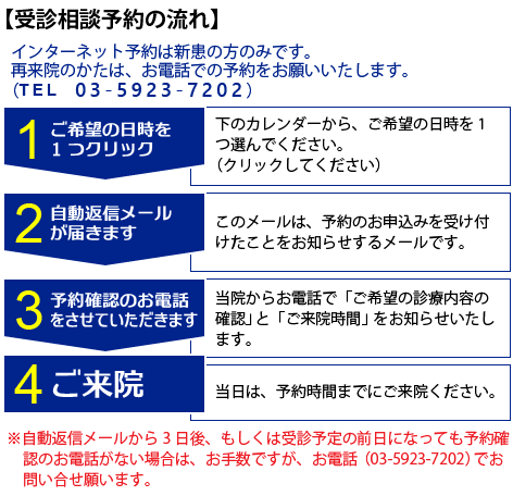 - ●予約を変更、もしくはキャンセルしたい方は、当院までお電話ください(TEL 03-5923-7202)